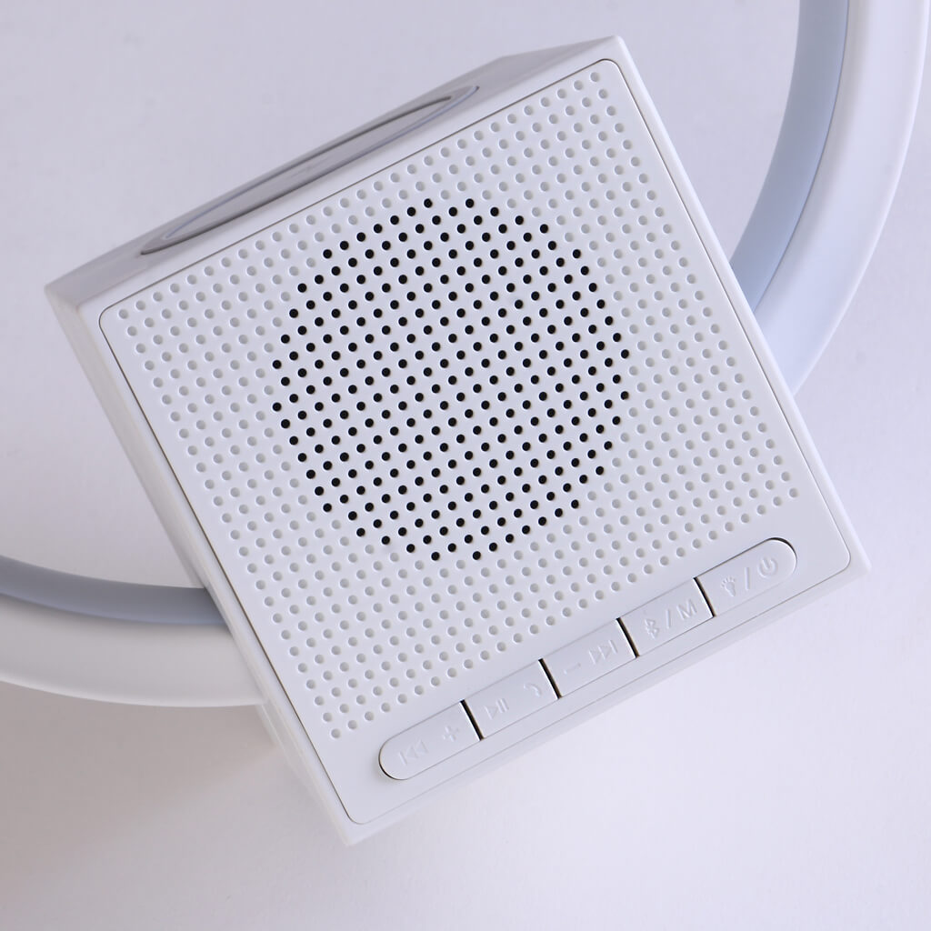 A multifunctional lamp that wirelessly charges your devices, plays music, and sets the mood with customizable lighting.