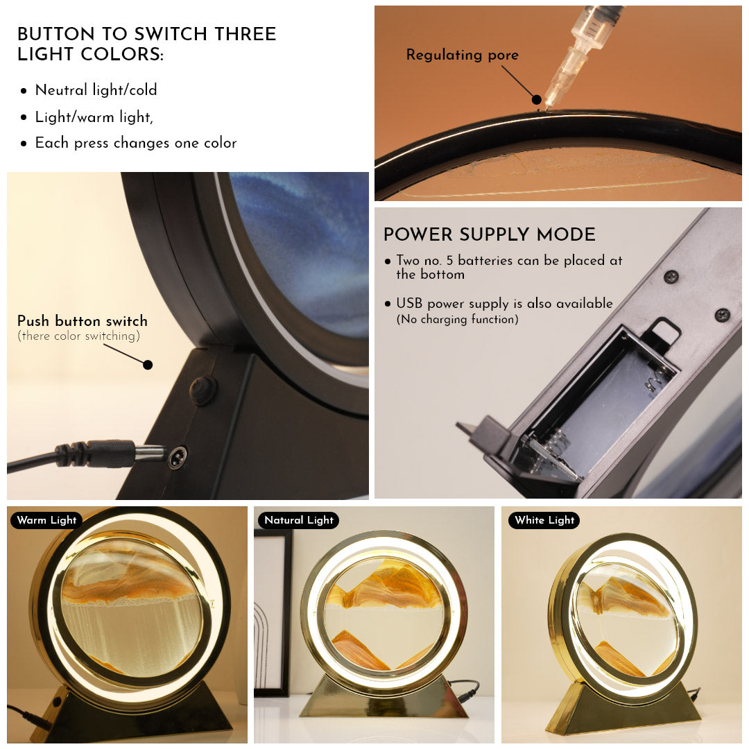 A calming decorative lamp with flowing sand art and ambient lighting, perfect for any space or mood.